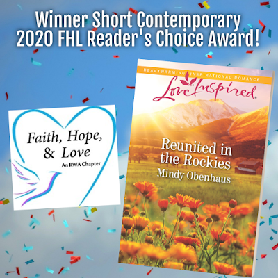 Mindy Obenhaus's Reunited in the Rockies won the Faith, Hope & Love Reader's Choice Award in the Short Contemporary category!