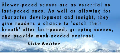 Again, the key is to get the balance right. If your story is composed of only long thoughtful passages, no matter how evocative or lyrical, your reader will find it much too easy to lose interest and close the book. On the other hand, if it’s all frantic, high-action scenes, then your reader may find it unsettling and confusing and perhaps unbelievable. Non-stop action, in fact, can have a numbing effect, and your scenes will lose much of their impact if there is no change in the pace.