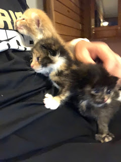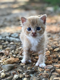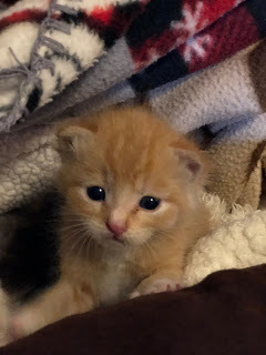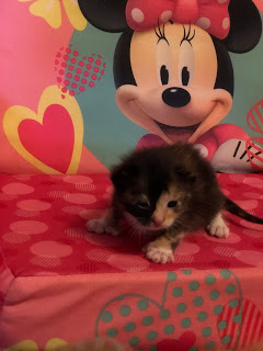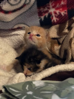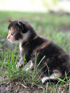 Cha-Cha (It's possible Cha-Cha is a boy.... hmmm)1) Clawing Our Way Up. When I found these kittens, they were starving for milk. They were loud and clawing their way up me, trying to suckle my chin. I didn’t have any pet-ag bottles, so used a dropper to get a bit of milk and rice water (I was desperate) in their stomachs. It didn’t help much. They were still screaming. I was a basket case and my husband was worse. He said they were not staying in the house. I searched the internet and found a recipe to make kitten formula and made two trips to town to get (human) baby bottles and the ingredients for a diy kitten formula. Since it was the weekend (isn’t it always?), I didn’t think I’d find any pet stores or veterinarians open that might have bottles small enough for their little mouths. For 48 hours, I donned the same milk-covered clothes and fed all three kittens with a baby bottle, then cleaned them up (use your imagination) and repeated the process every 3-4 hours.