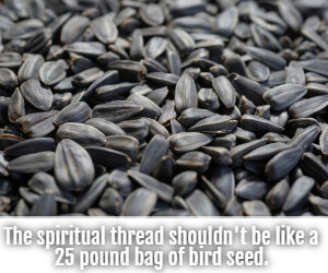 When writing an inspirational novel, the spiritual element has to be woven into the story line, making it impossible to remove and still have a working novel. It shouldn't be like a 25 pound bag of bird seed. Let me explain. Most times when we purchase a big bag of food for the birds, the bag is sewn shut. It appears to be a snarl of threads. But if you pull on the right string, the whole mess will completely unravel. All it takes is pulling on the correct thread. So too, if you removed your spiritual element, the whole novel would unravel because it's such an integral part of your story. That's how you want to write inspirational books.