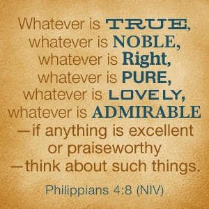 "Finally, brothers and sisters, whatever is true, whatever is noble, whatever is right, whatever is pure, whatever is lovely, whatever is admirable--if anything is excellent or praiseworthy--think about such things."