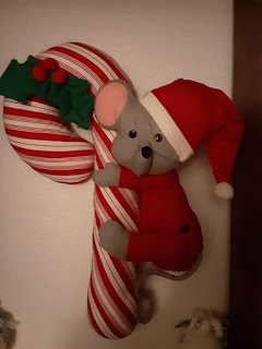 One of our other traditions is that with my family, we always made our gifts. This adorable mouse was made by my sister. So he goes up every year.
