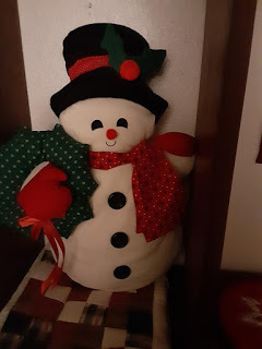 I inherited the snowman that my sister made for my mom. He goes up every year. I usually put him on the couch, but this year he is sitting in a bookcase because we are pet sitting a spaniel who loves sitting on the couch.