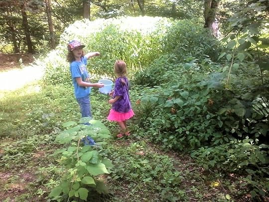 my daughters pointing out a patch of Jewelweed next to a berry patch After we filled our bowl - with plenty left unpicked - we made offerings on our outdoor altar. My oldest daughter asked if she could have a few berries to offer to the daoine sidhe; she took a handful and went and prayed for a bit before leaving them beneath our hawthorn tree. My younger children were more interested in eating the results of our efforts themselves (I believe my son may have eaten his own weight in berries).