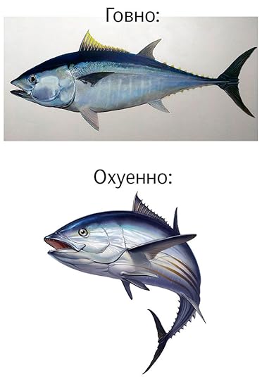 Говно: плоская мертвая рыба с приклеенными к туловищу плавниками. Охуенно: изогнутая живая рыба в движении с веерообразными плавниками.