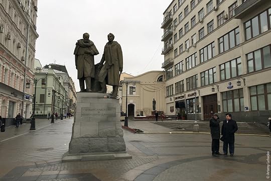 На некоторых улицах пиздец доходит до клинических показателей. Начало Камергерского. Тут стоят тихо-скромно в углу Чехов (на месте градусника), а теперь появились и Немирович с Данченко.