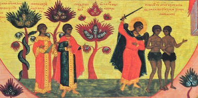 And the Christian metanarrative (yes, I know postmoderns don't like metanarratives) is that this theft and abuse of hospitality breaks the relationship between man (male and female, should anyone quibble) and God, and, whatever else it is, the cherub at the gate represents the inhuman face of God, which is the result of the broken relationship and how God appears to man after the break, until, in Jesus Christ, God appears again with a human face to restore the relationship.