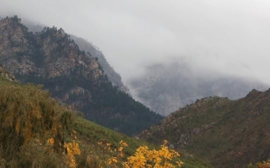 After spending fourdays at Volmoed, near Hermanus, mainly talking to John de Gruchy about our charismatic renewal book, we spent a couple of days at Villiersdorp, where Val's sister Elaine Machin has been living with a friend for 6 months.We took Elaine and her friend Avweil Anderson to Genadendal and Greyton, where the misty mountains looked like something out of Middle Earth.