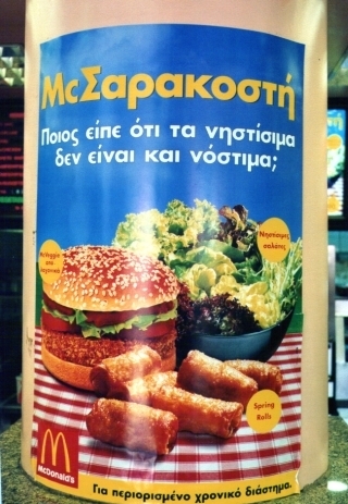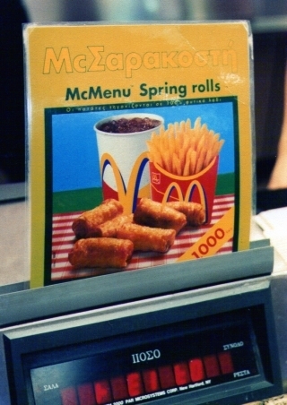 Somewhat surprisingly the one place in Athens where fasting food was quite easy to get was McDonalds. They offered a "McLent" special — a veggie burger or six spring rolls with chips. Strictly speaking, oil is only permitted at weekends, and so the fried chips weren't really Lenten fare, but at least they showed willing, more so than most of the local Greek restaurants did. And soon after that I read about some Hindu guy in the USA sueing McDonalds for having beef fat in the cooking oil in which they fried their "vegetarian" chips.