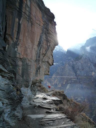 You can hike the entire gorge's length. It takes two full days to do so, but if you prefer to take it easy, you can stop mid-way and go down until you reach the road, and from there either go back to Lijiang or continue to Shangri-la. The lower level trail has disappeared and been replaced by a bitumen road (unfortunately) which travels along the gorge. It allows access for tourists who just want to have a look at the rapids and are not interested in hiking. An observation platform has been built at the bottom; it offers little interest. The road has just opened but is not used much because of impressive rock falls (see photo below).