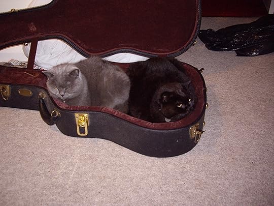The other day, however, they both decided that Hubby's guitar case was a fine place to sleep, and they spent several hours there. We thought it was very cute, and we took a picture.
