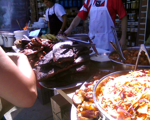 I’ve been living in Boston, off and on, since January — and since then, little rituals have evolved. One of them exists only in the summer, on Saturdays, and involves the spectacular barbecue at Formaggio’s — located near Harvard Square. The guys don’t start serving until around 11 am, but the line gets long by 10:45. And since we take food very seriously, we usually arrive well before that to stake out our spot.
