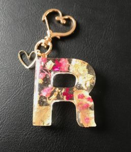 A cute R keyring made of resin with dried flowers inside.