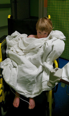 Sorry for the longer than usual radio silence, peeps, but we've had a bit of an emergency here at Casa de Aaron-Bach. My 3-year-old son got an infection in his leg that required racing to Atlanta for surgery and a lengthy stay at the pediatric hospital. As you can see, he was most displeased.