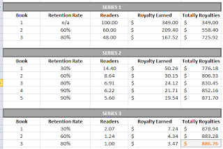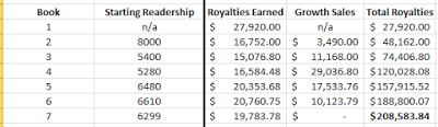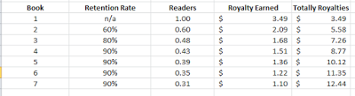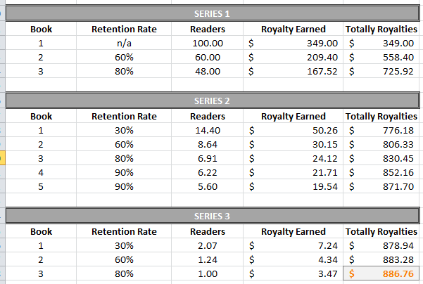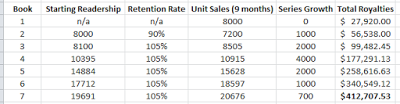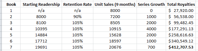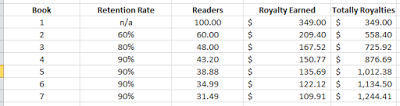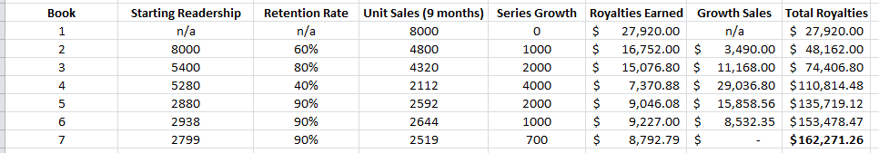 What these columns mean,Retention Rate = The percent of readers from the previous book who read the next one. For example, this chart says that 60% of people who read book 1 will go on to read book 2. I should disclaim that these rates you see here are very good. My examples assume that the series is excellently written.Royalties Earned = How much each individual book will earn in royalties in its first 9 months, which is about 70% of the royalties it'll earn in its first 2 years. Beyond that, the planning is totally different.Total Royalties = this is a running total of all royalties earned by all books. $12,454 is how much our test series will have made 9 months after book 7 comes out (it might earn more later, but we've found that 70% of a typical book's earnings happen during the first 9 months.)This chart shows the diminishing returns on readership that a long-running and highly sequential series suffers from. Book 4 only earns half as much as book 1 does! And book 7 is only one third earning power.