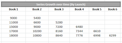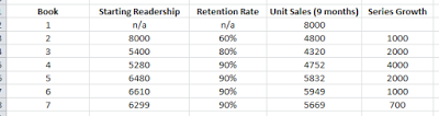 a modest and partially-hypothetical mid-listSeries Growth is what's important here. In a nutshell, it's how many book 1's each release on that list sells due to the buzz and attention it's launch creates. Keep in mind (cause these numbers won't add up otherwise) that if book 1 sells 1000 copies, then book 2 also sells more and book 3 sells more and so on. This next chart shows how that effect was incorporated in my example.