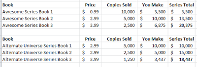 theoretical earnings on 1000 books sold at various price pointsFor most ebook sellers, going below $2.99 means dropping into a special 33% royalty bracket as opposed to the usual 70% or so. The per book earning power of a book at $2.99 is 6x greater than that of a book priced at $0.99 while not being 6x more expensive.Let me put this in another perspective. Going self-pub and selling for $0.99 means earning $0.33 per book. If you went with a standard NY contract, you'd get a lot more fame, build readership as fast or faster, and be paid a lot more per book. (25% net receipts on a $9.99 book is usually around $2 on average)