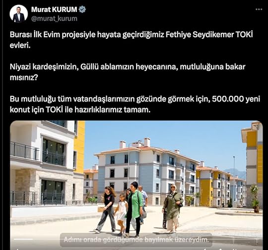 Çevre, Şehircilik ve İklim Değişikliği Bakanı Murat Kurum, TOKİ’nin İlk Evim Projesi kapsamında yapımını tamamladığı Muğla’nın Seydikemer ilçesindeki sosyal konutların görüntülerini paylaştı. Bakan Kurum yıl sonunda başlayacak 500 bin yeni sosyal konut projesine yönelik mesajında, “Niyazi kardeşimizin, Güllü ablamızın heyecanına, mutluluğuna bakar mısınız? Bu mutluluğu tüm vatandaşlarımızın gözünde görmek için, 500.000 yeni konut için TOKİ ile hazırlıklarımız tamam” ifadelerini kullandı.