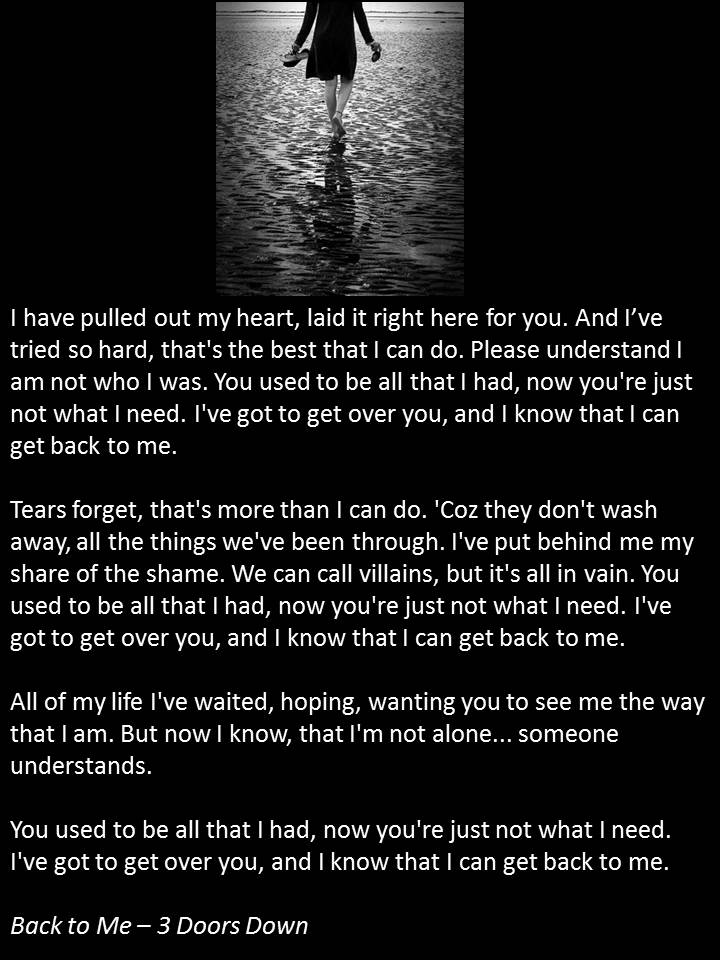 I’m not the same person I was six months ago, or a year ago, or six years ago. There was a time I needed something different, because I was different. I’m a new person now, and my needs have changed. If we haven’t changed together, then I must leave you behind. I can’t turn around and go back, that person doesn’t exist anymore. It doesn’t mean I didn’t love, need, appreciate or respect what we had together; it’s just not what I need any more. Whether it’s a marriage, a close friend, a lover, a career, a culture, a way of thinking, a passion, or a place …I have to be true to me or I’m no good for anyone… especially me. I’ve got to love me or I have NOTHING for anyone else.