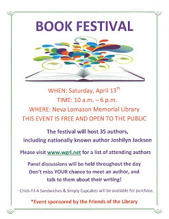 The Friends of the Library, an organization set up and run by volunteers, will host its first book festival on Saturday, April 13, from 10 a.m. to 6 p.m. at the Neva Lomason Memorial Library, located at 710 Rome St. in Carrollton. Please mark it on your calendar to plan ahead and to come because it will be a day of literary fun and it’s free.