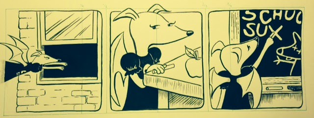 Then we spent the rest of the day inking our comic strip from the other day. Here is my character, Amret, flying into school and speaking her mind (it was an assignment, kind of Mad Libs-ish - not my personal opinion!) I did the entire thing with a regular little brush dipped into ink.