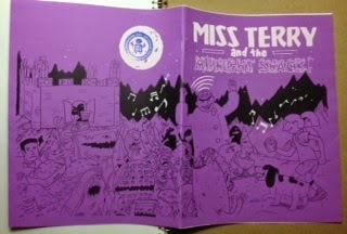 When we returned, it was to learn about silkscreening the covers. They had been photocopied onto purple paper and then we screen-printed the white letters and details on top. The white glows in the dark!!! How cool is that?