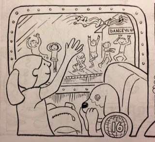 The evil doctor, Snackenstein, gets pulled up into the disco ball by the ghost of Lord Clefer. It snaps shut behind them. In the next scene Miss Terry, the sleuth, is back on the train, having solved the problem of the Zombie food and the grateful Danceylvanians are dancing her off at the station. Frankfort, the dog, has eaten way too much de-zombie-fied food. Yes. It IS a very strange story!
