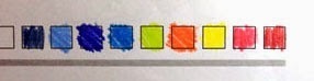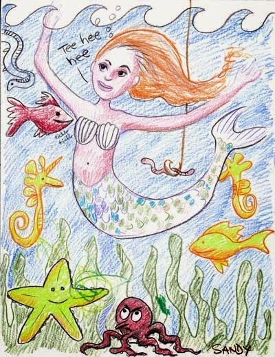 I showed her how to vary the amount of pressure put on the pencil to achieve lighter and darker areas with the same color (red ring, blue backgrounds, and body of fish)...