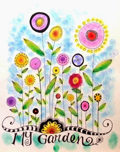 At this time - there was no garden growing, so I was inspired by a mural in my living room and a blog post on Busy Mockingbird (love that blog!!) where she uses fingerprints and stamp pads to do pointillism with her daughter... yeah! My piece was drawn with a sharpie Pen, then "painted" using my fingertips and Colorbox pigment ink pads.