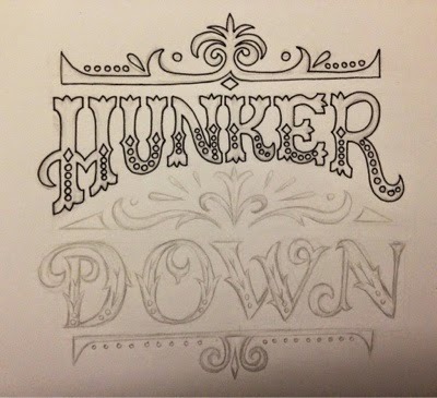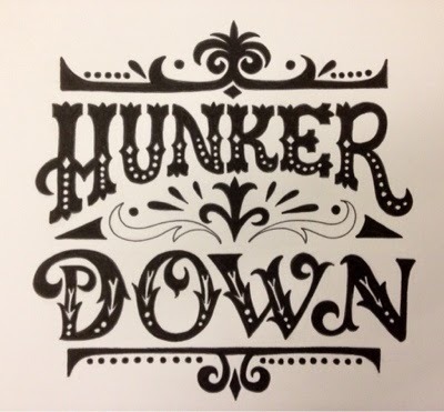 I have some trouble with getting things centered and spaced just right - but THAT part is easy enough to fix on the computer. For this Hunker Down piece (also good advice for me) I decided not to follow the exercise exactly and to leave some of the embellishments looking more organic and flowy. And I didn't add the fancy dropshadows that make it look more like a carnival poster.