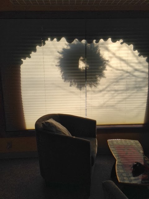 I started trying to decorate a bit today. I hung two wreaths outside the windows. The shadow on the inside blinds was really pretty...