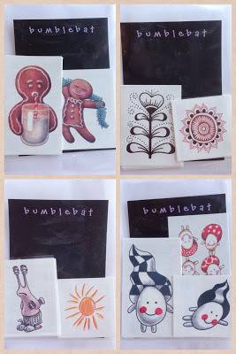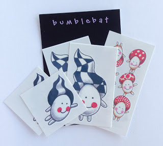 There are three sets of temporary tattoos, including the Gingerbread Set, the Grumpy Snail Set, the Tangle Set, and the Lilah Bean Set. Click the links to see details, sizes, prices, etc.