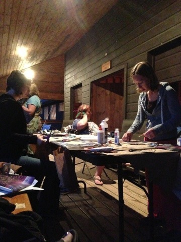 As for the afternoon class... I knew within ten minutes that this was a mistake! Children's Books and Collage with Rebecca Emberly. Rebecca is amazing and knows everything about the industry, but we were all feeling a little deflated because its not such a happy industry. Then when she spoke about contracts and publishers... Well, let's just say the day took a turn for the worse. :-( When we broke for a short break, we fled for the kitchen looking for cookies. The food lady gave us a trough of salsa and chips and we drowned our sorrows. One of my friends said, "now I understand why your cabin on the rocks (yesterday's post) was so inaccessible!" Indeed.