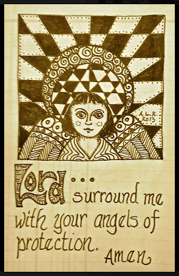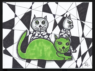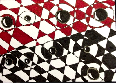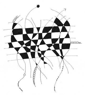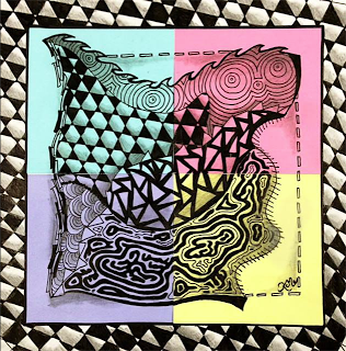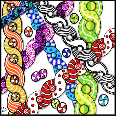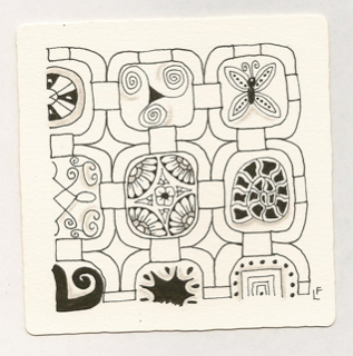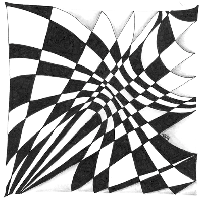Everyone seems to have gotten a little overwhelmed with the last two tangle patterns being on the more difficult side. So this week we will take a little bit of a breather and do a fairly easy one. Kaleido is like a checkerboard where someone (maybe a Lilah Bean?) has kicked all the vertical lines so they fall whilly-nilly. The horizontal lines stay parallel to each other. As you can see from my sample above with the Lilah Bean's hair, it works great with curved lines as well - just keep the horizontals straight. Or not... see what happens! Kaleido also looks really cool used as the "string" for a Zentangle - instead of coloring in the black sections - try using another tangle!
