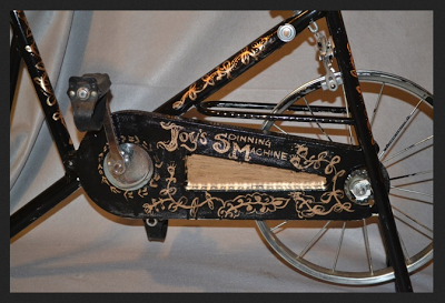 So I converted an exercise bike to a spinning wheel. I designed it to look like an antique sewing machine and used tangles inspired by your book to paint the frame. Here are a couple of photos.