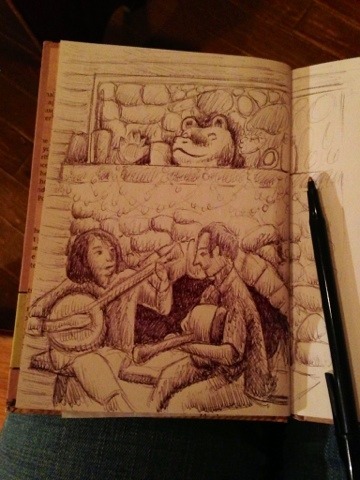 In case you can't imagine, here's a photo and the sketch I just did of the scene. I wish you were here with me to hear it. Magical.