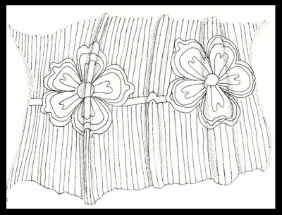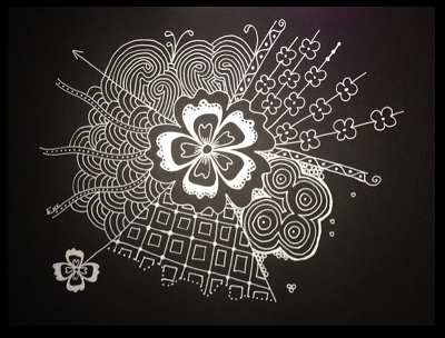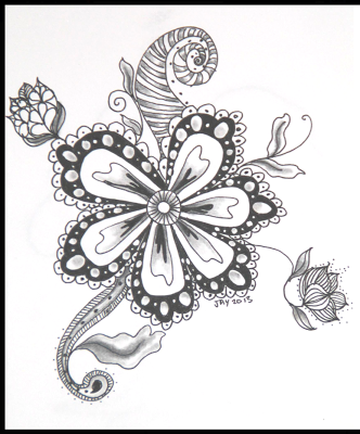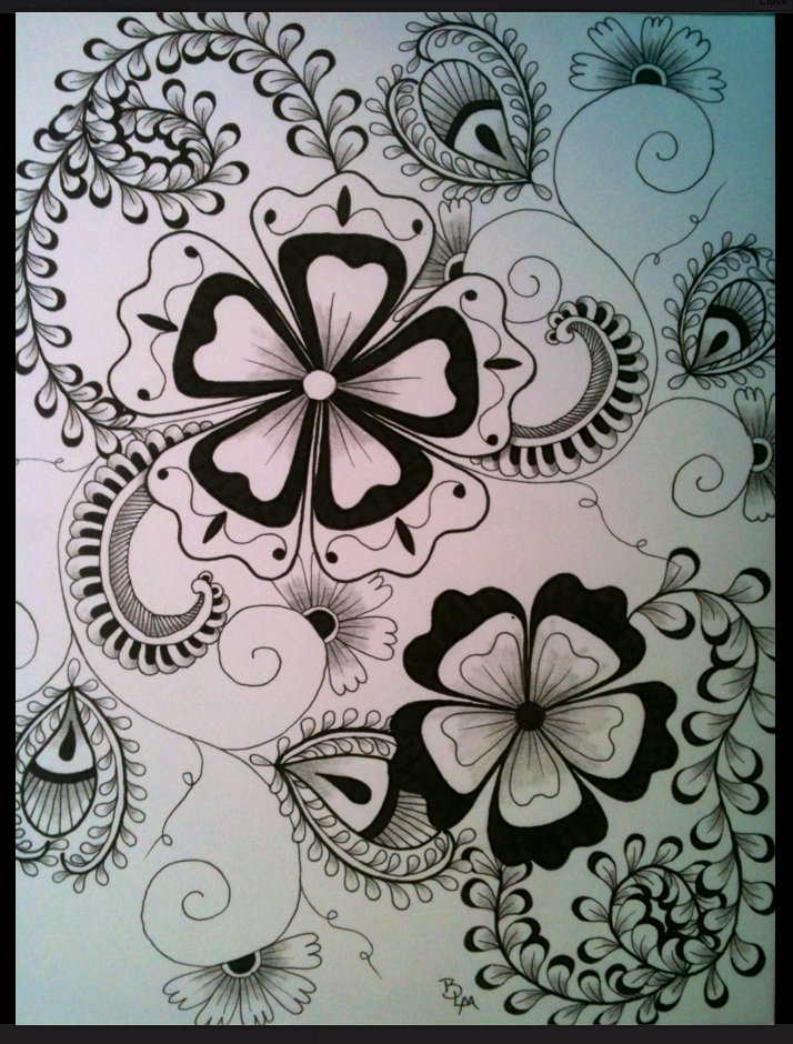 Annee was inspired by fancy, carved wood trim in a Newport (RI) mansion. The name came from the fact that I was starving while I drew it and it reminded me of a pretzel from the famous shopping mall destination of a similar name. One trick that I have learned - after drawing a gazillion of these - (and outside on a mural too) - is to draw the first steps... the circles and the curves on the left side... then FLIP your drawing 180 degrees and just repeat the curves down the side again. It is very easy.