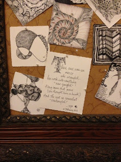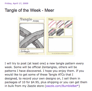 Notice the lovely Tangle Trading Card shown? You all know that I am just a tad OCD, (just a tad)... So I had designed these cards as a way for me to catalog and organize all the 100 existing Zentangle® patterns, plus the ones that I was creating on my own. I still sell the small packs on my Etsy store and you can get bulk packs (100 cards) in my Zazzle store. It's funny that I still use this Tangle of the Week card as my sample card in the shop. :-)