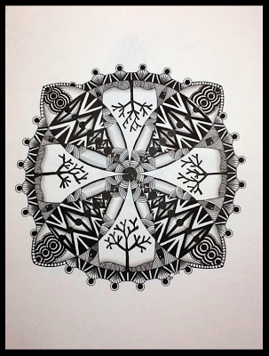 As you cruise the internet looking for Zentangle art and ideas, you start to see the difference between "doodles", Zentangle-ish art and Zentangle art by people who have had some training. Doodles are easily recognized as what they are because they are random and done in a thought-less way. Usually done while doing or thinking about something else. Unrelated. Talking on the telephone or daydreaming in a class or meeting. Zentangles are unplanned, but deliberate. The patterns are built "one stroke at a time" and they build on each other. The tangler doesn't "tune out", but rather "tunes IN". You become incredibly focused on what is evolving beneath your pen. You forget your worries for the moment. It is also very easy to see the difference between Zentangle art and Zentangle-like art. One dead giveaway is the dark lines outlining the "strings". Strings are guidelines that fade into the design when used properly. The characteristics that make a piece look like Zentangle: black and white, dense patterns within shapes, some shading - are what make some artists shake their heads and say "that's nothing new." But, again, these characteristics are not what make a real Zentangle, they are just the "look" - the end result. Zentangle is not a technique like watercolor or oil painting. It's more like... sand mandalas. It is horrifying for us to watch the monks (or anyone!) destroy those elaborate, gorgeous, detailed mandalas that they have slaved over for days - laying out each grain of sand, section by section. But, for the monks, it is all about the process, not the finished piece.