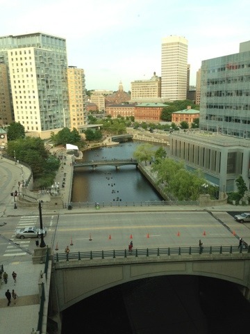 I always feel really strange when I am in Providence since it doesn't look much as it did when I went to school here. There was no river, and the downtown area was so dangerous, it was off limits. Now there are little art boutiques, restaurants, hotels, a beautiful park and skateboard park, and then there are the gondolas and river walks and a ginormous mall with an iMax theater built over the river. Oh yes, there's a river. We used to joke that Providence was the world's widest bridge. All this construction was being done while I was in school. We had a space of about three feet outside the Illustration building at RISD between us and the four lane highway. Now, there is an enormous brick... I don't even know the word?.... giant patio-thingy that goes for miles, and overlooks the canal and bridges. Jealous, me? Why would you say that? ;-) It's really pretty.