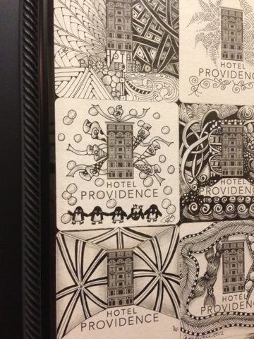 A mosaic in the Providence Hotel hallway of tangled bar coasters!
