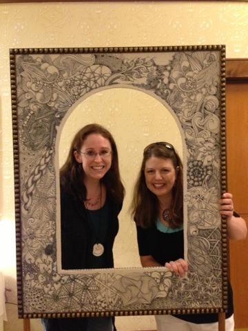 I think we really are this blurry in real life too... Me, Bette Abdu, Amy Broady, Katy AbbottToday, Tuesday, we CZTs who were not technically IN seminar, but were lurking around because we had family members in training - gathered together in the lobby to gossip and laugh and pretend to shoot a video about my new Tangle Cards. I think I have learned more out in the lobby than inside the seminar (LOL) - there are so many fascinating people here. And from all over the world!! I was so excited to meet ladies from Ecaudor, Latvia/Belgium, Sweden, South Africa and Alabama... and there are actually quite a few men here too. One is named "Dude". Yes. Dude. And my son and Caroline Broady are the youngest CZTs yet. Alex is 15 and Caroline is 14. Woo-hoo! A record! They will both be amazing CZTs. I was so proud of Alex - despite being groggy from cold medicine - he has been doing his best to be friendly and open-minded and he's been talking with people. I knew this was all worth it when, at dinner last night, he was asked what he might do with Zentangle, and he replied - "I think I'd like to teach it to my school. The entire school." And then went on to wonder how he could get enough supplies to give to all the students. Caroline is also pondering how to create a club at her school. Very cool kids!