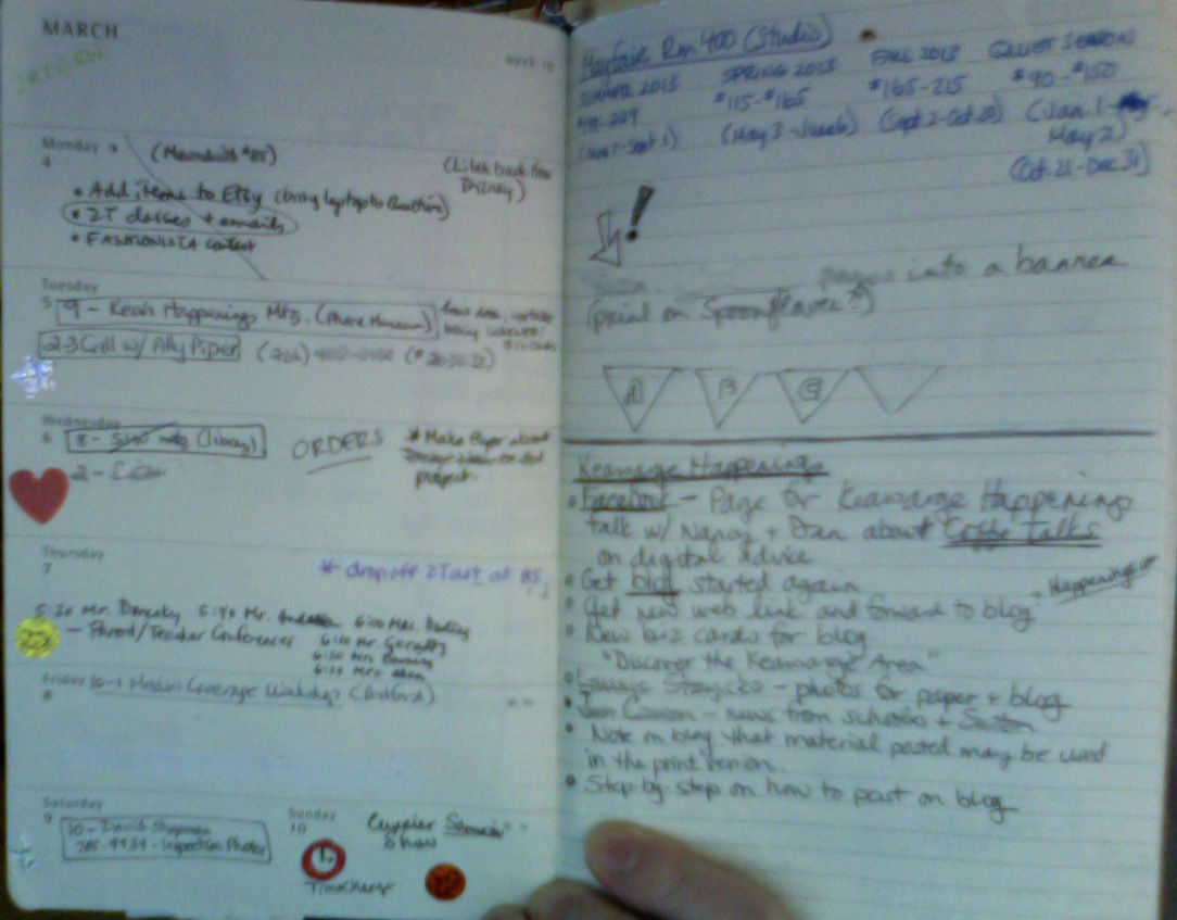 This is my calendar. I use a Moleskine journal that has a weekly calendar on the left page and a notebook page on the right. This works for me - I have to be able to write things out and make sketches, etc. with an actual pen on paper. But I am also a tech-geek. I want an app that will take a picture of this... mess... and auto-magically put the events and times in my Mac calendar, and the notes into Evernote and the people and phone numbers into Address Book. OMG. And I use the little stickers to keep track of when and how long I exercise. I want that on my computer and iPhone too!