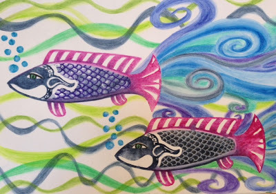 I made a new print in my sketchbook using the Inktense blocks (I learned this technique in the Inktense class I am taking online!) The bottom fish was the first stamping - nice and dark. I spritzed the stamp with water and did the second stamp - which didn't print as well... but ended up looking nicer after adding some more pencil work. I used a white gel pen to add the scales to the darker fish. And then I added swirls and waves until I could no longer see straight and went to bed.