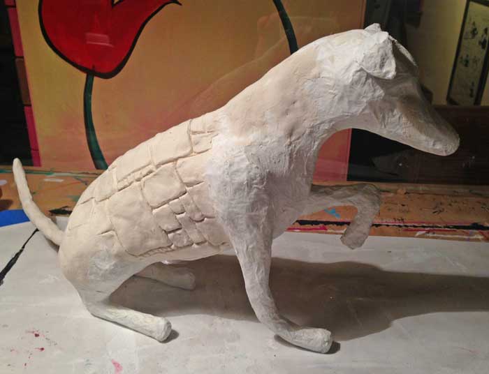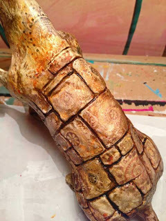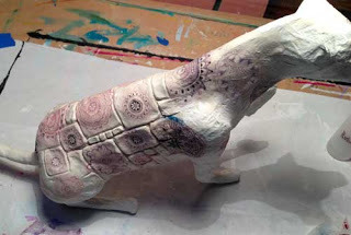 But then I was reminded of a cool technique by Bonnie Wright - one of my regular bees at The BeeHive. This is the perfect way to get images onto a textured surface... draw (or stamp, or transfer, etc.) the designs onto very thin white tissue paper. Then tear out the images (draw the tear line in water with a brush) and decoupage them onto your project.I used the Sheer Heaven to transfer my drawings to the tissue paper and then matte medium to adhere them to Binx.