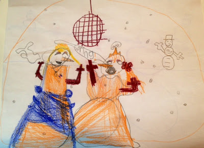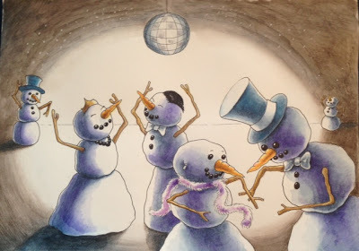 In true snowball fashion... ("I am too creative to accept a challenge at face value and I am determined to inject my perspective and personality into anything I decide to follow through with." )... Lilah improved on the party with ball gowns and better music. In fact, her Ball got so "hot" it brought on Spring and everyone started melting. Note the puddled snowman in the upper left.
