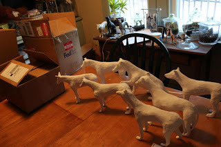 The dogs lining up to travel to their artists. Binx is the only one who is sitting.