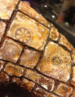 But then I was reminded of a cool technique by Bonnie Wright - one of my regular bees at The BeeHive. This is the perfect way to get images onto a textured surface... draw (or stamp, or transfer, etc.) the designs onto very thin white tissue paper. Then tear out the images (draw the tear line in water with a brush) and decoupage them onto your project.