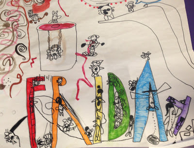 I designed the banner with a big, empty space on the left side so I could tangle it by hand. I thought it might be hard to get around to actually doing the work, but this weekend, Lilah and I unrolled the banner - and it completely covered the classroom table! What really inspired me to start was Lilah begging me to let HER do it!