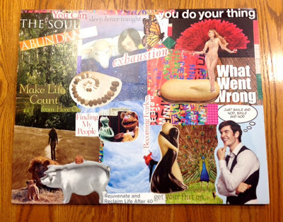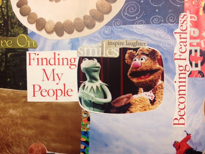 ... but as you rip out images and words, ideas form and change. One of my favorite parts was when I cut out the words "Finding My People" (making friends and finding my tribe are big goals for me). I was excited to find just the right phrase and looked around the big board for some people to stick it on.... I was getting a little desperate (how could I not have any friend-like images on here!?)